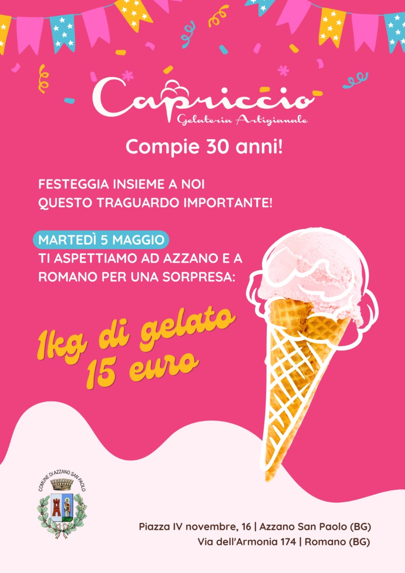 Il 5 maggio 2026 la storica gelateria Capriccio spegne 30 candeline 🥳 Dal 1996 : 30 anni di coni, coppette, sorrisi e momenti condivisi insieme a Voi. - 30 anni in cui siete passati da bambini a genitori… sempre con un gelato in mano.
